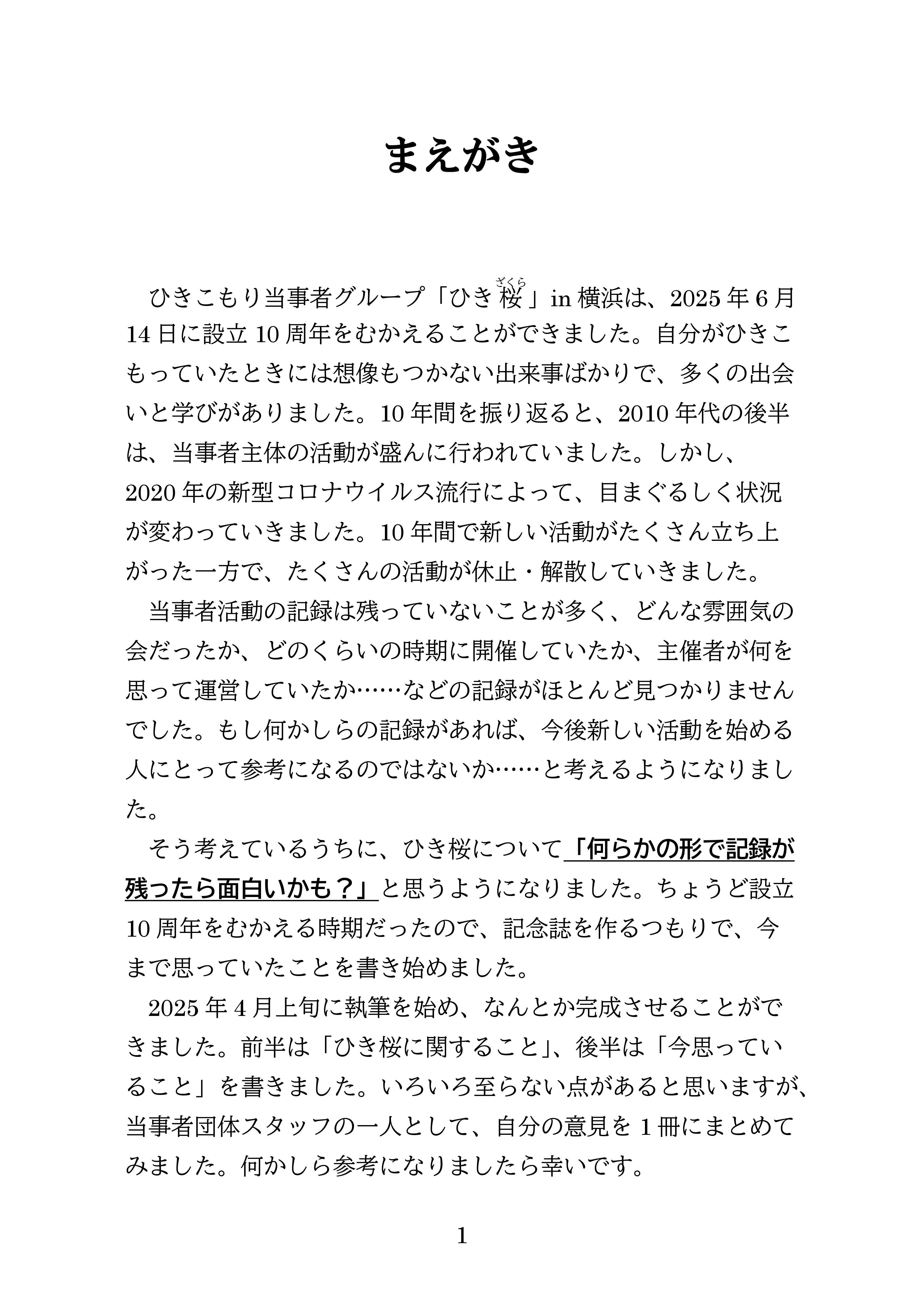 本書は「ひき桜」in横浜の設立10周年を記念して、10年間の出来事を振り返りつつ、ひきこもり経験者として思うことをまとめました。